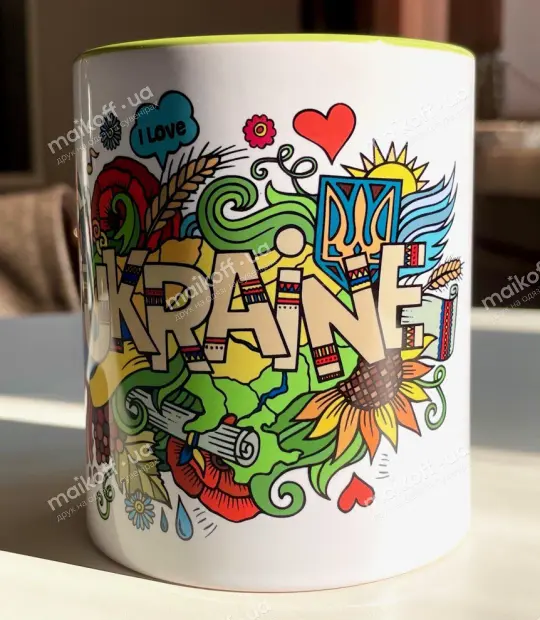 Нанести принт Ukraine на глянцевую керамическую чашку можно только на наружную сторону. Цвет принта можно заказать любой!