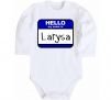 Боди для младенцев Hello my name is Larisa с длинным рукавом. Сшит из интерлока, 100% хлопок.