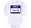 Боди для младенцев Hello my name is Vasily с длинным рукавом. Сшит из интерлока, 100% хлопок.