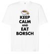 Футболка оверсайз прямого кроя с боковыми швами. Ткань 100% хлопок - мягкая и приятная на ощупь. После стирки при правильном уходе футболка не растягивается, не садится и не линяет. Нанести принт Keep calm and eat borsch на футболку oversize можно на грудь, на спину, на рукав. Цвет принта можно заказать любой!