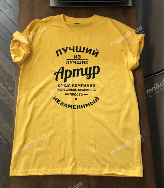Футболка прямого кроя без боковых швов. Ткань 100% хлопок - мягкая и приятная на ощупь. После стирки, при правильном уходе, футболка не растягивается, не садится и не линяет. Нанести принт Кращий з кращих Артур на футболку можно на грудь, на спину, на рукав. Цвет принта можно заказать любой!