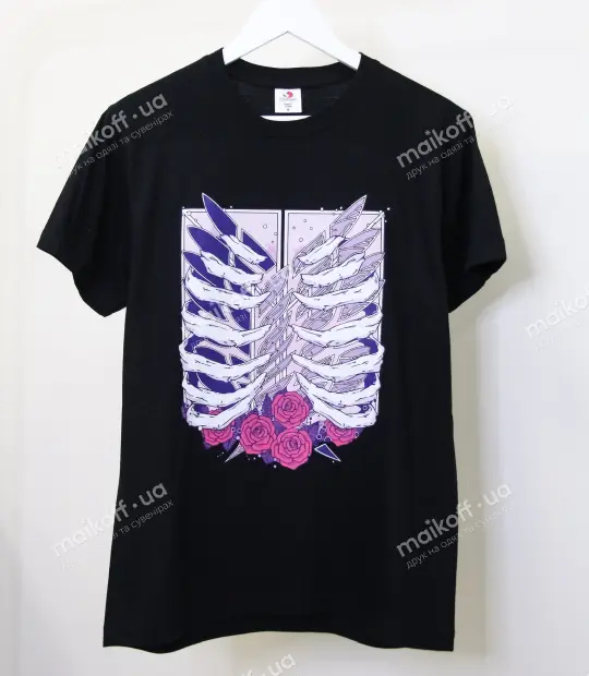 Футболка прямого кроя без боковых швов. Ткань 100% хлопок - мягкая и приятная на ощупь. После стирки, при правильном уходе, футболка не растягивается, не садится и не линяет. Нанести принт Атака титанів ребра на футболку можно на грудь, на спину, на рукав. Цвет принта можно заказать любой!