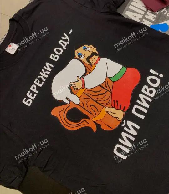 Футболка прямого кроя без боковых швов. Ткань 100% хлопок - мягкая и приятная на ощупь. После стирки, при правильном уходе, футболка не растягивается, не садится и не линяет. Нанести принт Бережи воду - пий пиво на футболку можно на грудь, на спину, на рукав. Цвет принта можно заказать любой!