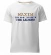 Мужская премиум-футболка собственного производства. Выполнена из качественной ткани (95% хлопок, 5% эластан) — плотная, мягкая и приятная к телу. Принт Maxim the man the myth the legend можно нанести на грудь, спину или рукав.