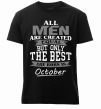 Мужская премиум-футболка собственного производства. Выполнена из качественной ткани (95% хлопок, 5% эластан) — плотная, мягкая и приятная к телу. Принт The best are born in October можно нанести на грудь, спину или рукав.