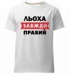 Мужская премиум-футболка собственного производства. Выполнена из качественной ткани (95% хлопок, 5% эластан) — плотная, мягкая и приятная к телу. Принт Льоха завжди правий можно нанести на грудь, спину или рукав.
