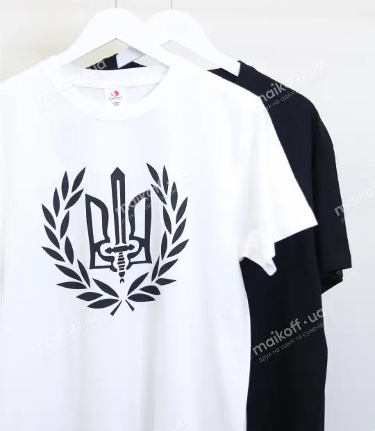 Футболка прямого кроя без боковых швов. Ткань 100% хлопок - мягкая и приятная на ощупь. После стирки, при правильном уходе, футболка не растягивается, не садится и не линяет. Нанести принт Україна тризуб-меч на футболку можно на грудь, на спину, на рукав. Цвет принта можно заказать любой!