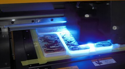 Метод нанесения на сувенирную продукцию (из пластика, стекла, картона, керамики, металла). Используются специальные УФ чернила, застывающие под воздействием ультрафиолетового излучения.
