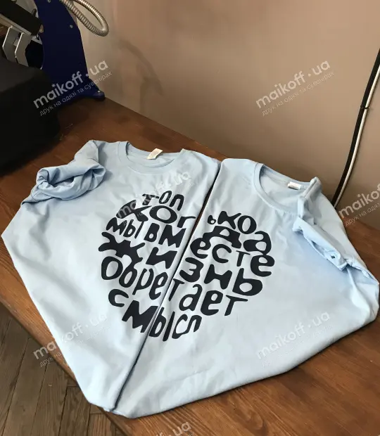 Закажите себе мужскую футболку с нанесенной на ней частью романтической надписи: «Только когда мы вместе, жизнь обретает смысл», а своей второй половине - женский вариант с ее продолжением. Дизайн таков, что только когда вы будете рядом надпись на ваших футболках превратится в осмыленный текст, ведь в жизни у вас все точно так же.