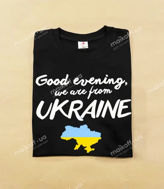 Футболка прямого крою без бічних швів. Тканина 100% бавовна - м'яка та приємна на дотик. Після прання при правильному догляді футболка не розтягується, не сідає і не линяє. Нанести принт Good evening we are frome ukraine мапа України на футболку можна на груди, на спину, на рукав. Колір принта можна замовити будь-який!