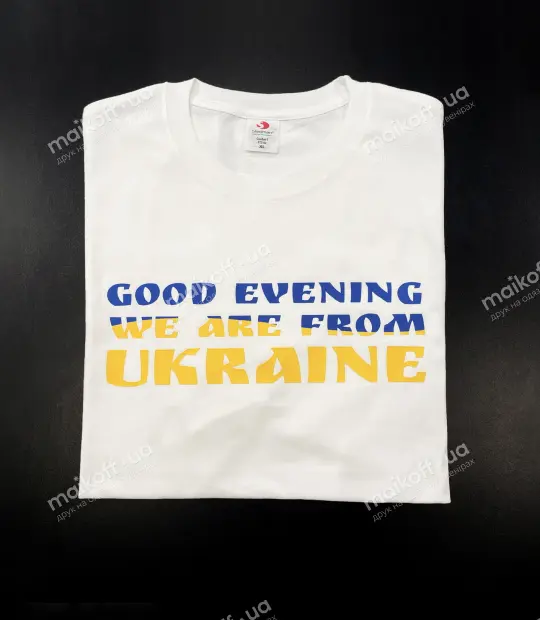 Футболка прямого крою без бічних швів. Тканина 100% бавовна - м'яка та приємна на дотик. Після прання при правильному догляді футболка не розтягується, не сідає і не линяє. Нанести принт Good evening we are from ukraine прапор на футболку можна на груди, на спину, на рукав. Колір принта можна замовити будь-який!