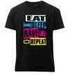 Чоловіча преміум-футболка власного виробництва. Виготовлена з якісної тканини (95% бавовна, 5% еластан) — щільна, м'яка та приємна до тіла. Принт eat sleap rave repeat можна розмістити на грудях, спині або рукаві.