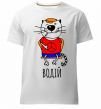 Чоловіча преміум-футболка власного виробництва. Виготовлена з якісної тканини (95% бавовна, 5% еластан) — щільна, м'яка та приємна до тіла. Принт Кот водій можна розмістити на грудях, спині або рукаві.