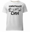 Чоловіча преміум-футболка власного виробництва. Виготовлена з якісної тканини (95% бавовна, 5% еластан) — щільна, м'яка та приємна до тіла. Принт Найкращий у світі син можна розмістити на грудях, спині або рукаві.