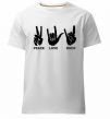 Чоловіча преміум-футболка власного виробництва. Виготовлена з якісної тканини (95% бавовна, 5% еластан) — щільна, м'яка та приємна до тіла. Принт PEACE LOVE ROCK можна розмістити на грудях, спині або рукаві.