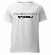 Чоловіча преміум-футболка власного виробництва. Виготовлена з якісної тканини (95% бавовна, 5% еластан) — щільна, м'яка та приємна до тіла. Принт You know who is душніла? можна розмістити на грудях, спині або рукаві.