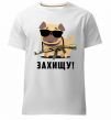 Чоловіча преміум-футболка власного виробництва. Виготовлена з якісної тканини (95% бавовна, 5% еластан) — щільна, м'яка та приємна до тіла. Принт Захищу! пес можна розмістити на грудях, спині або рукаві.