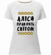 Жіноча преміум-футболка власного виробництва приталеного крою. Виготовлена з якісної тканини (95% бавовна, 5% еластан) — щільна, м'яка та приємна до тіла. Принт Аліси правлять світом можна розмістити на грудях, спині або рукаві.