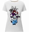 Жіноча преміум-футболка власного виробництва приталеного крою. Виготовлена з якісної тканини (95% бавовна, 5% еластан) — щільна, м'яка та приємна до тіла. Принт Міньйон з фруктами можна розмістити на грудях, спині або рукаві.