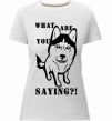 Жіноча преміум-футболка власного виробництва приталеного крою. Виготовлена з якісної тканини (95% бавовна, 5% еластан) — щільна, м'яка та приємна до тіла. Принт What are you saying можна розмістити на грудях, спині або рукаві.