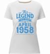 Жіноча преміум-футболка власного виробництва приталеного крою. Виготовлена з якісної тканини (95% бавовна, 5% еластан) — щільна, м'яка та приємна до тіла. Принт This Legend was born in April 1958 можна розмістити на грудях, спині або рукаві.