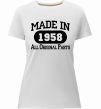 Жіноча преміум-футболка власного виробництва приталеного крою. Виготовлена з якісної тканини (95% бавовна, 5% еластан) — щільна, м'яка та приємна до тіла. Принт Made in 1958 All Original Parts можна розмістити на грудях, спині або рукаві.