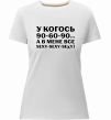 Жіноча преміум-футболка власного виробництва приталеного крою. Виготовлена з якісної тканини (95% бавовна, 5% еластан) — щільна, м'яка та приємна до тіла. Принт У когось 90 60 90 можна розмістити на грудях, спині або рукаві.