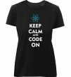 Жіноча преміум-футболка власного виробництва приталеного крою. Виготовлена з якісної тканини (95% бавовна, 5% еластан) — щільна, м'яка та приємна до тіла. Принт Keep calm and code on можна розмістити на грудях, спині або рукаві.