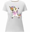 Жіноча преміум-футболка власного виробництва приталеного крою. Виготовлена з якісної тканини (95% бавовна, 5% еластан) — щільна, м'яка та приємна до тіла. Принт Dabbing unicorn with star можна розмістити на грудях, спині або рукаві.