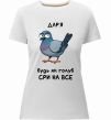 Жіноча преміум-футболка власного виробництва приталеного крою. Виготовлена з якісної тканини (95% бавовна, 5% еластан) — щільна, м'яка та приємна до тіла. Принт Дар'я будь як голуб можна розмістити на грудях, спині або рукаві.