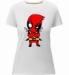 Жіноча преміум-футболка власного виробництва приталеного крою. Виготовлена з якісної тканини (95% бавовна, 5% еластан) — щільна, м'яка та приємна до тіла. Принт Дедпул з мечами можна розмістити на грудях, спині або рукаві.