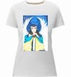Жіноча преміум-футболка власного виробництва приталеного крою. Виготовлена з якісної тканини (95% бавовна, 5% еластан) — щільна, м'яка та приємна до тіла. Принт Дівчина ангел України можна розмістити на грудях, спині або рукаві.