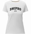 Жіноча преміум-футболка власного виробництва приталеного крою. Виготовлена з якісної тканини (95% бавовна, 5% еластан) — щільна, м'яка та приємна до тіла. Принт Dnipro est можна розмістити на грудях, спині або рукаві.