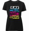 Жіноча преміум-футболка власного виробництва приталеного крою. Виготовлена з якісної тканини (95% бавовна, 5% еластан) — щільна, м'яка та приємна до тіла. Принт eat sleap rave repeat можна розмістити на грудях, спині або рукаві.