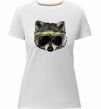 Жіноча преміум-футболка власного виробництва приталеного крою. Виготовлена з якісної тканини (95% бавовна, 5% еластан) — щільна, м'яка та приємна до тіла. Принт Єнот в окулярах з прапором можна розмістити на грудях, спині або рукаві.