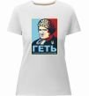 Жіноча преміум-футболка власного виробництва приталеного крою. Виготовлена з якісної тканини (95% бавовна, 5% еластан) — щільна, м'яка та приємна до тіла. Принт Геть з України можна розмістити на грудях, спині або рукаві.
