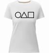 Жіноча преміум-футболка власного виробництва приталеного крою. Виготовлена з якісної тканини (95% бавовна, 5% еластан) — щільна, м'яка та приємна до тіла. Принт Гра в кальмара фігури можна розмістити на грудях, спині або рукаві.