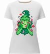 Жіноча преміум-футболка власного виробництва приталеного крою. Виготовлена з якісної тканини (95% бавовна, 5% еластан) — щільна, м'яка та приємна до тіла. Принт Грінч в сердечках можна розмістити на грудях, спині або рукаві.