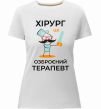 Жіноча преміум-футболка власного виробництва приталеного крою. Виготовлена з якісної тканини (95% бавовна, 5% еластан) — щільна, м'яка та приємна до тіла. Принт Хірург це озброєний терапевт можна розмістити на грудях, спині або рукаві.