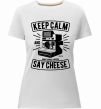 Жіноча преміум-футболка власного виробництва приталеного крою. Виготовлена з якісної тканини (95% бавовна, 5% еластан) — щільна, м'яка та приємна до тіла. Принт Keep Calm And Say Cheese можна розмістити на грудях, спині або рукаві.