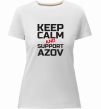 Жіноча преміум-футболка власного виробництва приталеного крою. Виготовлена з якісної тканини (95% бавовна, 5% еластан) — щільна, м'яка та приємна до тіла. Принт Keep calm and support Azov можна розмістити на грудях, спині або рукаві.