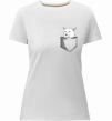 Жіноча преміум-футболка власного виробництва приталеного крою. Виготовлена з якісної тканини (95% бавовна, 5% еластан) — щільна, м'яка та приємна до тіла. Принт Кіт-мем у кишені можна розмістити на грудях, спині або рукаві.