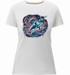 Жіноча преміум-футболка власного виробництва приталеного крою. Виготовлена з якісної тканини (95% бавовна, 5% еластан) — щільна, м'яка та приємна до тіла. Принт Космос кит космонавт можна розмістити на грудях, спині або рукаві.