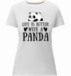 Жіноча преміум-футболка власного виробництва приталеного крою. Виготовлена з якісної тканини (95% бавовна, 5% еластан) — щільна, м'яка та приємна до тіла. Принт Life is better with a panda можна розмістити на грудях, спині або рукаві.