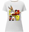 Жіноча преміум-футболка власного виробництва приталеного крою. Виготовлена з якісної тканини (95% бавовна, 5% еластан) — щільна, м'яка та приємна до тіла. Принт Looney Tunes персонажі можна розмістити на грудях, спині або рукаві.