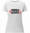 Жіноча преміум-футболка власного виробництва приталеного крою. Виготовлена з якісної тканини (95% бавовна, 5% еластан) — щільна, м'яка та приємна до тіла. Принт Люба бабуся (серця) можна розмістити на грудях, спині або рукаві.
