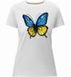 Жіноча преміум-футболка власного виробництва приталеного крою. Виготовлена з якісної тканини (95% бавовна, 5% еластан) — щільна, м'яка та приємна до тіла. Принт Метелик жовто-блакитний можна розмістити на грудях, спині або рукаві.