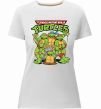 Жіноча преміум-футболка власного виробництва приталеного крою. Виготовлена з якісної тканини (95% бавовна, 5% еластан) — щільна, м'яка та приємна до тіла. Принт Ninja turtles with pizza можна розмістити на грудях, спині або рукаві.