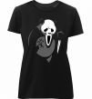 Жіноча преміум-футболка власного виробництва приталеного крою. Виготовлена з якісної тканини (95% бавовна, 5% еластан) — щільна, м'яка та приємна до тіла. Принт ПАНДА з фільму крик можна розмістити на грудях, спині або рукаві.