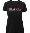Жіноча преміум-футболка власного виробництва приталеного крою. Виготовлена з якісної тканини (95% бавовна, 5% еластан) — щільна, м'яка та приємна до тіла. Принт Правила можна розмістити на грудях, спині або рукаві.